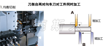 | 三、斯大走心機(jī)SR-38typeB采用門型刀架臺采用均等負(fù)荷橫向?qū)蚪Y(jié)構(gòu),抑制直動導(dǎo)軌軸承所受的力矩負(fù)重至最小限度,確保刀架臺剛性,并在門型刀架臺的后面排刀座附加X3控制軸,通過X1、X3軸同步控制實(shí)現(xiàn)對工件進(jìn)行均衡切削,抑制工件偏轉(zhuǎn)實(shí)現(xiàn)高精度加工,縮短切削時間。 |