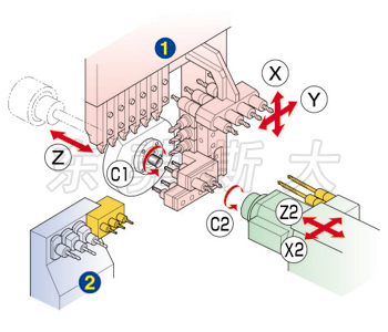 三、斯大走心機SR-20JtypeC橫向鉆孔5軸單元下方2軸,采用模塊化設計,可根據工件需要自由安轉可交換式工具,實現工藝的靈活性,通過功能模塊的組合,輕松實現各種變化,以此獲得機床的最佳結構。