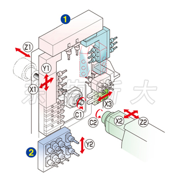 三、斯大走心機SR-38typeA采用門型刀架臺采用均等負荷橫向導向結構,抑制直動導軌軸承所受的力矩負重至最小限度,確保刀架臺剛性,并在門型刀架臺的后面排刀座附加X3控制軸,通過X1、X3軸同步控制實現對工件進行均衡切削,抑制工件偏轉實現高精度加工,縮短切削時間。
